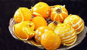۴- پرتقالهای پوست شده ی آماده را از هم جدا کرده وبا میوه های پوست شده ی دیگر مثل سیب وکیوی وآناناس وخیار حلقه وخورد شده به طور جدا گانه در ظرفهای چند قسمتی یا ظرف گردی که خودتان آنها را جدا گانه می چینید قرار داده وبرای پذیرایی با یک چنگال آماده کنید.