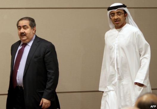 هوشیار زیباری وزیر امور خارجه عراق در کنفرانس خبری مشترک با عبد الله بن زاید آل نهیان همتای اماراتی خود در ابوظبی.