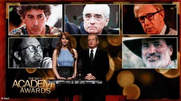 در بخش بهترین کارگردان، میشل هازاناویسیوس (آرتیست)، الکساندر پین (اولاد)، مارتین اسکورسیزی (هیوگو)، وودی آلن (نیمه شب در پاریس)، ترنس مالیک (درخت زندگی) کاندید شدند.