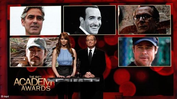 برای دریافت جایزه بهترین هنرپیشه مرد نقش اول، جورج کلونی (اولاد)، ژان دوژاردن (آرتیست)، برد پیت (مانی بال)، گری اولدمن (بندزن، خیاط، سرباز، جاسوس) و دیمین بیچیر (زندگی بهتر) کاندیدای جایزه اسکار شدند.