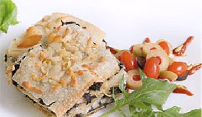 فر را با حرارت 350 درجه فارنهایت (175 درجه سانتیگراد) روشن میکنیم. در ظرفی پنیر فتا و گودا را با اسفناج، تخممرغ نمک و فلفل مخلوط میکنیم. کره و روغن را روی حرارت ملایم قرار داده و کف قالب مناسب فر را با آن چرب مینماییم. چهار ورق از خمیر یوفکا را روی قالب پهن و به وسیله برس روی آن کمی از مخلوط کره و روغن میمالیم. مقداری از مایه آماده شده اسفناج را روی ورق یوفکا گذاشته و این عمل را تکرار میکنیم تا در مرحله آخر ورق خمیر یوفکا را گذاشته روی آن کره و روغن میزنیم و به مدت 35 الی 40 دقیقه در طبقه وسط فر قرار میدهیم. سپس از فر بیرون آورده، خامه را با پنیر موزارلا مخلوط کرده و روی آن میریزیم و 10 دقیقه دیگر درفر گذاشته و سپس سرو میکنیم.