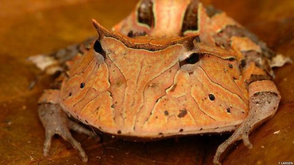 قورباغه پک من (Ceratophrys cornuta) یک شکارچی با دهانی بسیار بزرگ است که با آن می تواند شکاری را به بزرگی خودش ببلعد از جمله پرنده، موش و سایر قورباغه ها.