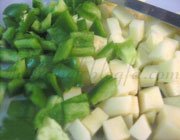 * سیب زمینی و فلفل دلمه‌ای را نگینی خرد کنید و کنار بگذارید.
