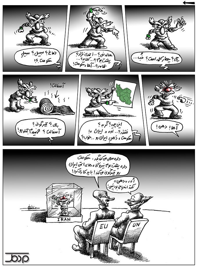 درست است که غربیها فقط بفکر مسائل اتمی حکومت هستند ولی باید توجه کرد که به هیچ قیمتی حکومت اسلامی نباید به سلاح اتمی دست پیدا کند فکرشو بکنید اگر مالک بمب هسته ای شوند بیخیال قدرتهای خارجی پوست مردم را میکنند بگذریم که منطقه خاورمیانه -کانون حماقت- را وارد یک مسابقه دست یابی به سلاح اتمی میکنند بمبهایی مهیب با صاحبانی غیر مسئول.اگر غربیها بتوانند جلوی ساخت بمب را بگیرند باقی کار را خود ما باید انجام دهیم. ما نباید مانند افغانی ها از جامعه جهانی طلبکار باشیم این کاریکاتور این را تداعی میکند که به نظر من خبط و خطاست. ضمنا خوبه گاهی اول فکر کنیم و بعد اگر موضوع خنده دار بود بخندیم .میبخشید!