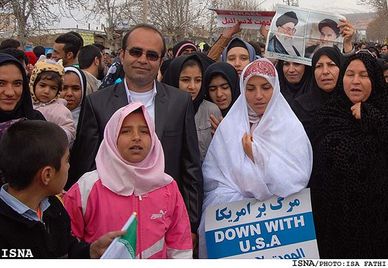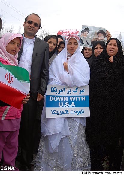 عروس خانمو ببین روز عروسی به جای دسته گل پلاکارد مرگ بر آمریکا در دست گرفته آخر عاقبت چنین ازدواج ننگینی که با آرزوی مرگ برای دیگران آغاز شود معلوم و مشخص است البته از یک مشت بیسواد بی فرهنگ بیشتر از این هم نمی شود توقع داشت .