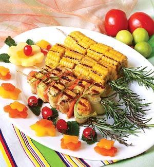 ذرتها را با آب و مقداری نمک بپزید و اجازه دهید کاملا نرم شود. برگهای ساقه رزماری را به غیر از چند تای انتهای ساقه بگیرید. سینه مرغ را به صورت مکعبی برش داده و در مایهای که شامل ماست، زیره، زنجبیل، زعفران، فلفل و نمک ریخته و اجازه دهید به مدت دو ساعت مزهدار شود. سپس مرغها را خارج کرده و در سیخهای رزماری فرو کرده و لابهلای آن هویج خردشده بگذارید. تابه را با روغن چرب کرده و کبابها را در آن قرار دهید. بعد از مدتی برگردانده تا تمام اطراف سیخ پخته شود و سپس با ذرت پخته و حلقه شده سرو کنید.
