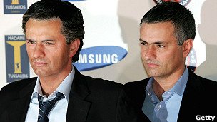 خوزه مورینیو در کنار مجسمه خود در موزه مادام توسو بریتانیا. مورینیو موفقترین مربی تاریخ باشگاه چلسی است