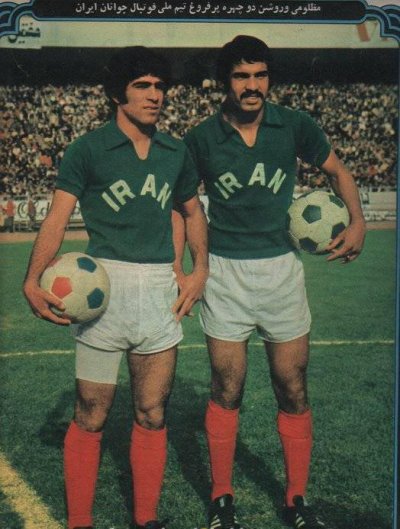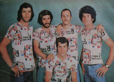 عصر ایران ورزشی- بازیکنان تیم ملی فوتبال ایران در سال 1974، از سمت چپ به ترتیب : زنده یاد ناصر حجازی , زنده یاد صفر ایران پاک , محمود خردبین , مسعود مژدهی و نفر نشسته ، علی پروین