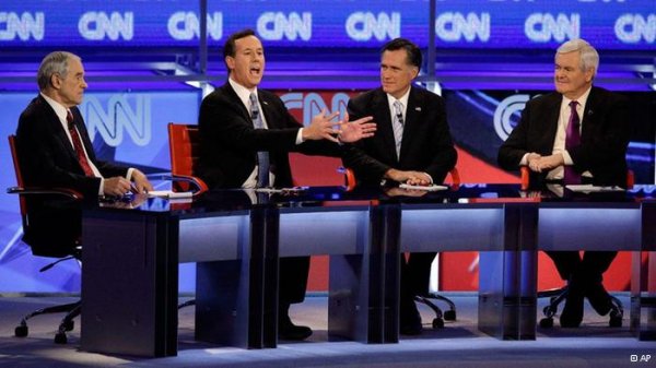 چهار نامزد حاضر از حزب جمهوریخواه در دور مقدماتی اتنخابات ریاست جمهوری آمریکا از چپ: ران پال، ریک سانتوروم، میت رامنی و نیوت گینگریچ