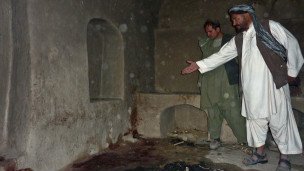 پس از حمله سرباز آمریکایی به غیرنظامیان در قندهار، آثار خون و سوختگی در روی خانه ها دیده می شود
