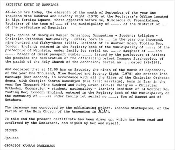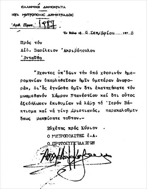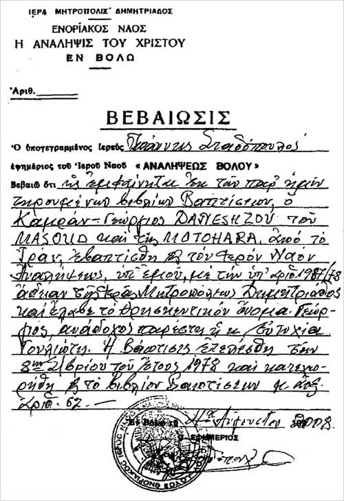 پس از شکست تلاش های ما در پاریس و لندن به یونان رفتیم تا مدارک اصلی را در آن جا مورد جستجو قرار دهیم. زمانی که به دنبال مکانی که کامران دانشجو در آن جا غسل تعمید داده شده بود رفتیم به شخص سالخورده ای برخورد کردیم که شاهد غسل های تعمید بوده است.