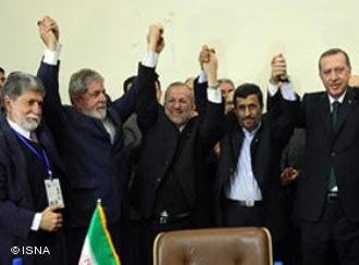 اردوغان، احمدینژاد و داسیلوا پس از امضای توافقنامهی مبادلات بازرگانی در سال ۲۰۱۰ در تهران