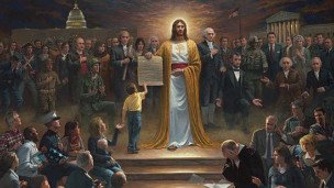 تابلوی "ملتی زیر عنایت خداوند" عیسی مسیح در مرکز اثر، قانون اساسی امریکا را در دست گرفته است درحالیکه "رهبران استقلال" و مردم امریکا با اندوه و پریشانی زیر پای او افتادهاند