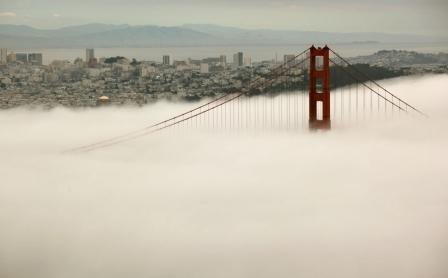 در افق سان فرانسیسکو و در چشم انداز جنوب پل دروازه طلایی این شهر، گویی که این پل در مه غرق شده است.