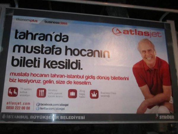 این بیلبورد که در فرودگاه و سطح شهر استانبول دیده می شود،مردم را به استفاده از یک شرکت هواپیمایی دعوت می کند. چهره سرشناسی هم که برای ترغیب مردم استفاده شده،مصطفی دنیزلی است. روی بیلبورد به زبان ترکی نوشته شده :بلیت تهران آقا مصطفی را ما صادر کردیم". در بخش دیگری از این بیلبورد نوشته شده که "تمام بلیت های رفت و برگشت تهران- استانبول مصطفی دنیزلی از سوی شرکت ما صادر می شود