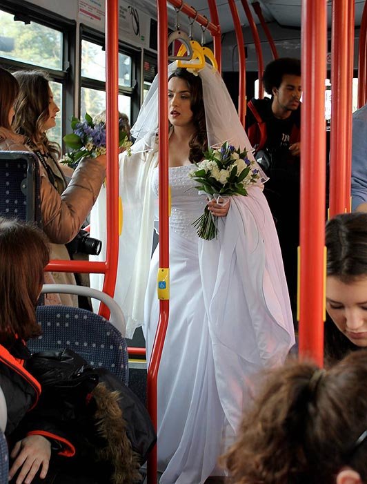 این عروس خانم 28 ساله ساکن لندن روز عروسی اش تصمیم گرفت مسافت خانه تا کلیسا را با یک اتوبوس عمومی طی کند و با این کار همه مسافران این اتوبوس را شوکه کرد. در حالی که همه عروس ها دوست دارند با کالاسکه های سفید به کلیسا رفته و لحظه های رومانتیکی خلق کنند خانم جنی کلوکو این فاصله را با وسیله نقلیه عمومی طی کرد.