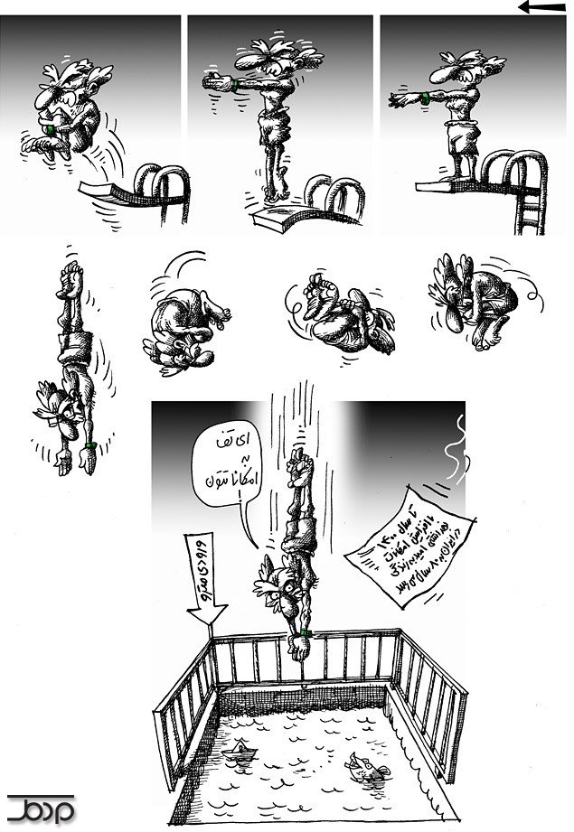 بهرام اولا به تو هیچ ربطی ندارد که چرا دیگران از کشور خارج می شوند ، تو حق نداری به دیگران توهین کنی. چرا دروغ می گویی ؟!! برخلاف نظر جنابعالی نه تنها در غرب امکانات زیاد هست بلکه روز به روز هم بیشتر می شود و هرگز با ایران قابل مقایسه نیست!! اگر کسی توانایی و لیاقت داشته باشد حتی اگر هم خارجی باشد می تواند مو قعیت و شغل خوب بدست بیاورد. حالا اگر تو موفق نشدی مشکل خودت است!! می توانی برگردی ایران وساندیس مجانی بخوری!! در ایران برای پیشرفت و پول دار شدن نه لیاقت می خواهد و نه شایستگی اتفاقا برعکس هر چه بی لیاقت تر و پست تر و بی سواد تر باشی وضعیت بهتری خواهی داشت ! که نمونه بارز آن احمدی نژاد، سید علی گدا، رفسنجانی و عهد و عیالش و خلاصه همه عوامل ریز و درشت جمهوری کثیف و ضد بشری اسلامی. واقعیت اینست که وضعیت ایران بسیار وخیم تر از اینست که از کاریکاتور پدر بزرگ برداشت می شود.