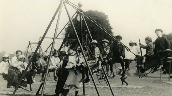 اما این فقط سرسره نبود که با استقبال عمومی مواجه شده بود؛ در این عکس بچه ها را می بینید که مشغول تاب سواری بر تاب های چوبی آن زمان هستند.