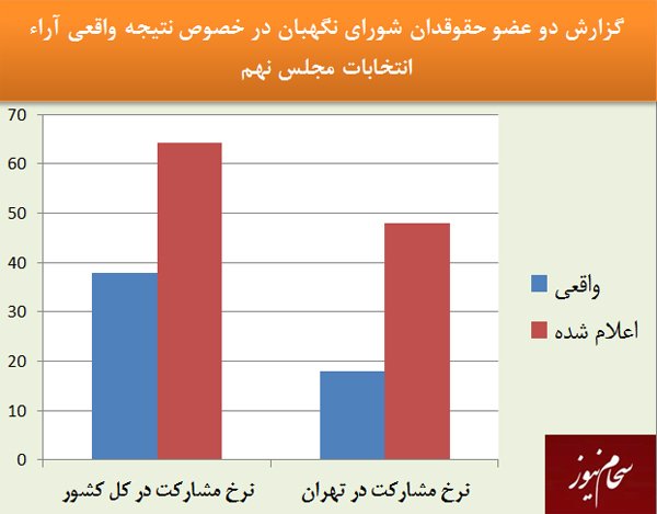 به گزارش سایت جرس؛ آن مقام عالی رتبه کشور پس از شنیدن آمار واقعی، می پرسد «آیا رهبری از این آمار اطلاع دارند؟» حقوقدانهای شورای نگهبان پاسخ می دهند که گزارش آمار واقعی انتخابات به عرض معظم له رسیده است اما آمار کل کشور روی منحنی برده شده است و کلیه آمار اعلام شده بین ۲۵ تا ۳۰ درصد بیش از نرخ واقعی مشارکت مردم بوده است.