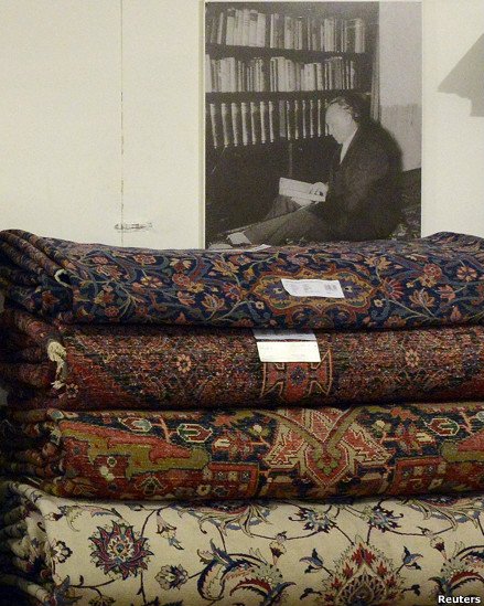 علاوه بر ممنوعیت ورود فرش ایرانی به آمریکا، اعمال تحریم های دیگر علیه ایران و همچنین محرومیت بانک های تحت تحریم ایرانی از دسترسی به خدمات سوئیفت (که برای نقل و انتقال جهانی پول لازم است) وضعیت این تاجران را بیش از پیش بدتر کرده است. عکس بالا: کپی یک روزنامه چاپ ۱۹۵۴ که کنراد آدنائر صدر اعظم وقت آلمان را نشان می دهد و فرش هایی که در این بازارچه در انتظار خریدارند.
