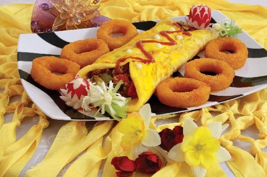 * تخممرغ را با چنگال زده و درون تابه را کمی روغن ریخته و تخممرغ را در تابه میریزیم وقتی خودش را گرفت مواد را وسط تخممرغ ریخته و دو طرف آن را روی مواد بر میگردانیم.