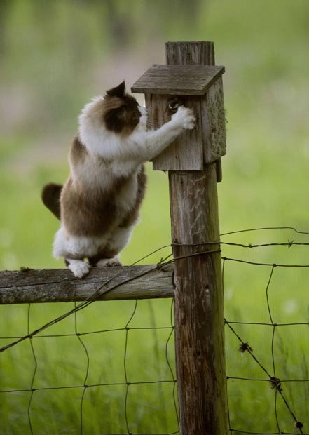 گربه بازیگوش در پی باز کردن یک لانه چوبی پرنده ( اورگان آمریکا)