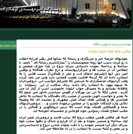 « نفوذی های عرصه خبر و خبرنگاری و رسانه که سالها قبل رهبر فرزانه انقلاب با رو کردن دست آنها رویه منحوسشان را "شارلاتانیزم رسانه ای " نامید، با ساخته و پرداخته نمودن داستانی سراپا دروغ در غذا خوری مجلس و انعکاس آن در سایت ها و خبرگزاریهایشان و درج نظرات هتاکانه و توهین آمیز ذیل آنها (علیرغم ادعای ادب و تنفر از هتاکی!) نسبت هایی را به اینجانب داده اند که گرچه قابلیت تعقیب قضایی دارد ولی من تلف کردن وقت گرانبهای خدمتگزاری به مردمی که علیرغم خواست این دروغپردازان به شیوه یهود، به اینجانب رای دادند ،برای شکایت از این رسوایان را عاقلانه نمیدانم و به مصداق جواب ابلهان خاموشی است از کنار آن می گذرم .