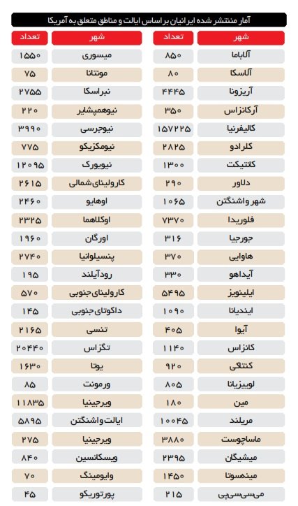 اگر 15-10درصد ضریب خطا برای این اشتباه در نظر گرفته شود، جمعیت ایرانیان مقیم این کشور حول و حوش 300هزار نفر است که بیشترین تعداد در ایالت کالیفرنیا (با 157هزارو 225 نفر) و کمترین تعداد در ایالت داکوتای جنوبی (40 نفر) ساکن هستند. اهمیت آمار ایرانیان آمریکا میتواند از جنبههای مختلف بررسی شود. به لحاظ سیاسی این جمعیت میتواند در روند تصمیمگیریهای سیاسی تاثیرگذار باشد و بهخصوص در صورت بهبود روابط سیاسی با آمریکا، ایرانیان میتوانند بهعنوان سفرای فرهنگی ایران و فرهنگ ایرانی نقش برجستهای در زدودن سهدهه کدورت سیاسی بین دو کشور ایفا کنند. بسیاری از ایرانیان دارای موقعیتهای شغلی ممتازی در آمریکا بوده و در مقایسه با سایر اقوام مهاجر به این کشور دارای سطح تحصیلی و سرانه ثروت بیشتری هستند. گشودن گره سیاسی و دیپلماتیک بین دو کشور ایران و آمریکا نتیجه برد – برد برای مردم دو کشور خواهد بود.
