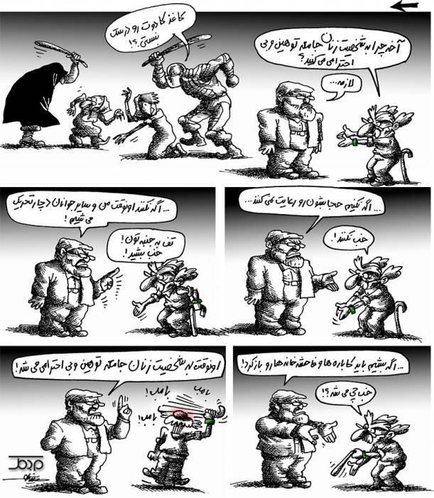 آخوندهای بی عبا و عمامه هم همین نظر را دارند! فقط امیدوارم آقایانی که تحقیر زنان را محکوم میکنند،با خودشان هم صادق باشند و فقط شعار ندن.در زندگی زناشوییشان با همسرشان چه برخوردی دارند؟ چون مشکل جامعه ایران از خانوادهها شروع میشود.همین دوستان دور و بر ما،آقایی با افتخار از تابو شکنی زنان میگفت،چنان آب و تاب که بیا و ببین.هفته بعد قرار بود با چند تا از خانوما بریم سینما و یه فیلم ببینیم و یک شب با هم شام بخوریم.این آقا اجازه نداد همسرش بیاید.حالا اون به خودشون مربوط بود،عملا توی جمع بهش گفت نه،نباید بری ! خیلی عوضی بازی در آورد.بیچاره خانومش خیلی خجالت کشید.درد جامعه ایران اینها هستند،وگرنه سپاه و بسیج که واسه این کاراشون پول میگرن،آخوند جماعت هم که نانش توی این کار هست.