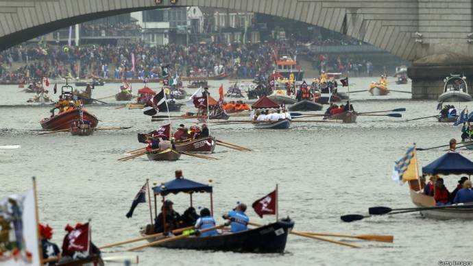 تخمین زده اند که تعداد پرچمهایی که برای تزئین در سراسر کشور مورد استفاده قرار گرفته است برابر با مسافت 50،000 مایل میباشد !!!!!!! با وجود هوای بارانی و سردِ امروز ، مراسم بسیار باشکوه و زیبائی در مسیر رودخانۀ تایمز در حال برگزاریست.