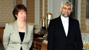 سعید جلیلی (راست) و کاترین اشتون (چپ) روسای هیاتهای مذاکرهکننده درباره فعالیتهای هستهای ایران