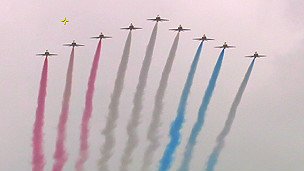 عملیات آکروباتیک هوایی توسط "پیکانهای سرخ"، تیم خلبانان ویژه آکروباتیک نیروی هوایی بریتانیا