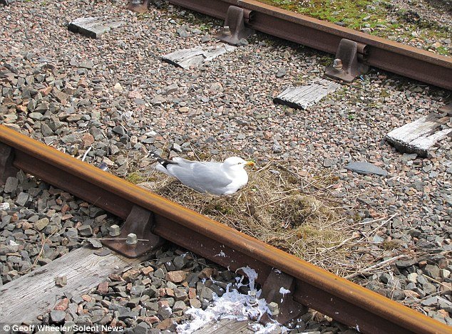 لانه سازی یک مرغ دریایی در کنار ریل راه آهن در اسکاتلند