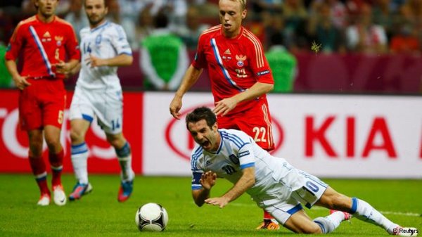 صحنهای از دیدار یونان و روسیه که با برتری یک بر صفر یونان به پایان رسید