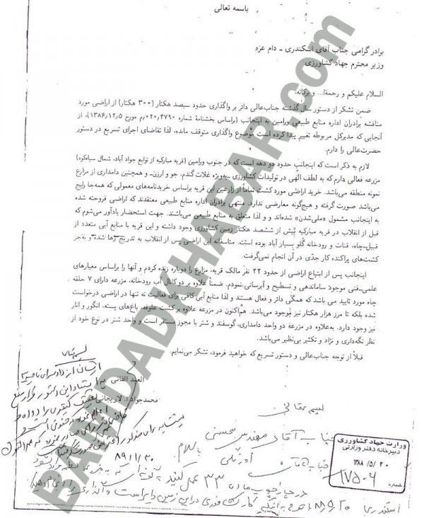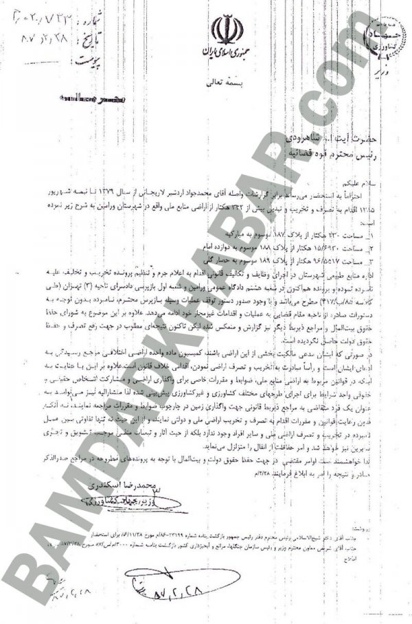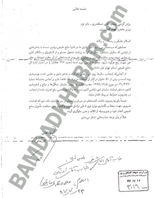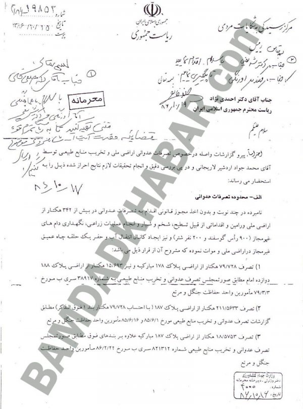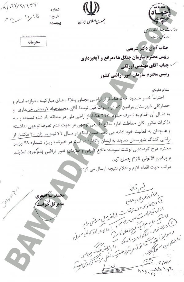 اینها عناوین نامههایی بود که به تازگی به دست “بامدادخبر” رسیده است. نامههایی مرتبط با خانواده لاریجانی به ویژه تصرفات محمدجواد لاریجانی و حجتالاسلام صادق لاریجانی در اراضی طبیعی حومه ورامین.