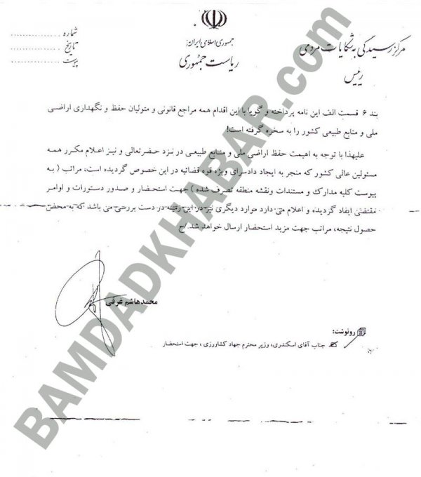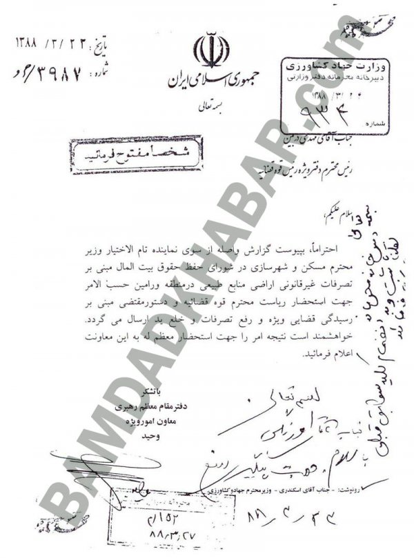 به تازگی پوشهای محتوی ۱۲ برگه از اسناد محرمانه دولتی به امضای اشخاص مختلفی مانند محمدجواد لاریجانی، وحید، دستیار ویژه بیت رهبری، محمدرضا اصغری، مدیرکل حراست وزارت جهادکشاورزی، مهندس اسکندری، وزیر جهادکشوری دولت نهم و… به دست بامدادخبر رسیده و بامدادخبر بنا بر رسالت خبری خود اقدام به انتشار این پرونده کرده است.