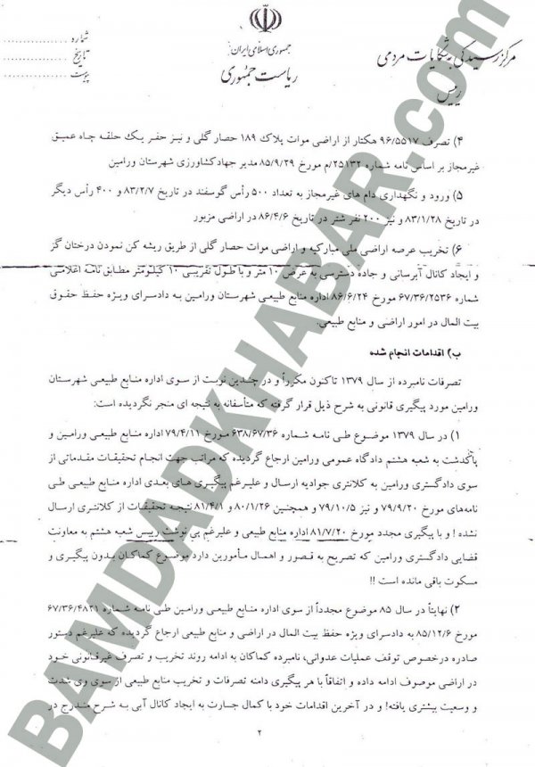 از مهمترین عناوینی که در این نامههای ذکر شده است میتوان به تصرف بیش از ۳۴۲ هکتار اراضی ملی در حاشیه ورامین، حفر چندین حلقه چاه غیر مجاز در این منطقه، نگه داری بیش از ۹۰۰ راس گوسفند و ۲۰۰ نفر شتر به صورت غیرقانونی در دامداریهای احداث شده در اراضی تصرفی توسط محمدجواد لاریجانی اشاره کرد.(اسناد شماره ۵،۶ و ۷)