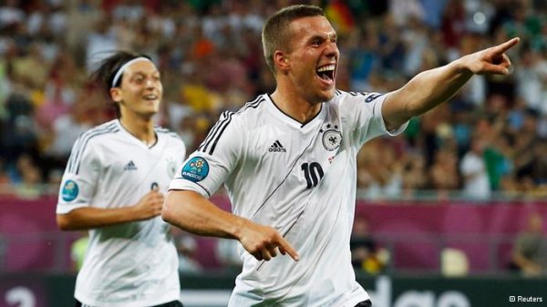 لوکاس پودلسکی (راست) در یکصدمین بازی ملی خود موفق به گشودن دروازه حریف شد
