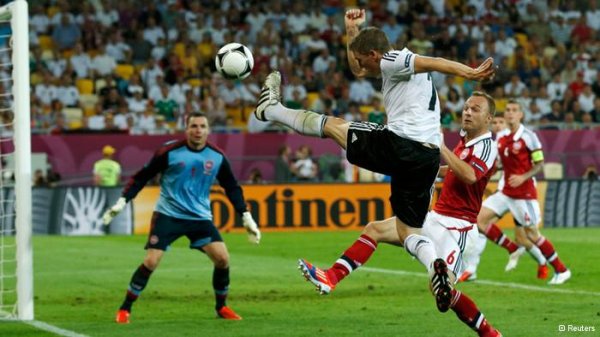 آلمانیها از همان آغاز بازی تیم دانمارک را زیر فشار قرار دادند. در دقیقه ششم توماس مولر فرصتی طلایی برای بازکردن دروازهی حریف را در محوطهی شش قدم قرمزپوشان دانمارک از دست داد.