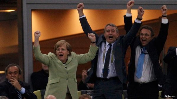 از چپ: میشل پلاتینی، رئیس اتحادیه فوتبال اروپا، آنگلا مرکل، صدراعظم، وولفگانگ نیرزباخ، رئیس فدراسیون فوتبال، و هانس پتر فریدریش، وزیر کشور آلمان