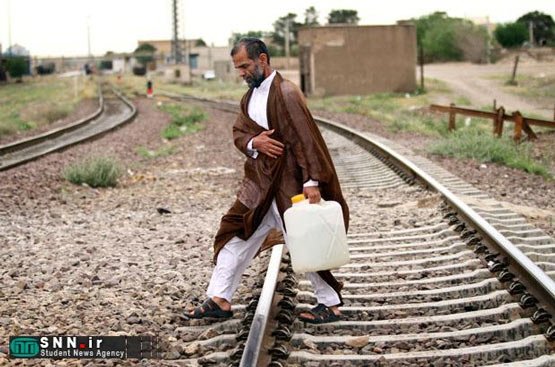 عکس ۶ را نگاه کن مردم آب برای خوردن ندارن٬ این آخوند زشت ۳۰ نمیدونم ۴۰ لیتری آب را میبره اون ور راه آهن توی صحرا خیر سرش........