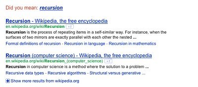 کلمه Recursion را در گوگل تایپ کنید سپس گوگل جمله معروف did you mean recursion را نمایش دهد. در صورتی که دیکته هر دو لغت وارد شده توسط شما و آنچه گوگل پیشنهاد می دهد یکسان است. Recursion در دنیای کامپیوتر مفهوم خاص خود را دارد و به معنای روشی است که راه حل یک مشکل بستگی به حل مشکل کوچکتر مرتبط با آن را دارد.