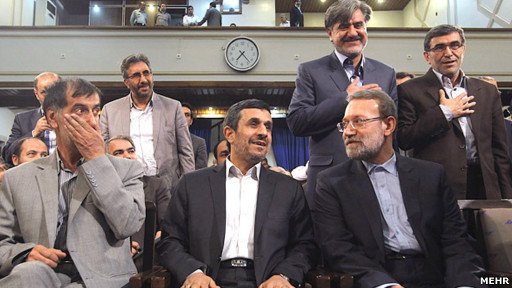 علی لاریجانی (راست) و محمدرضا باهنر (چپ) در دیدار محمود احمدینژاد (وسط) با نمایندگان مجلس شورای اسلامی