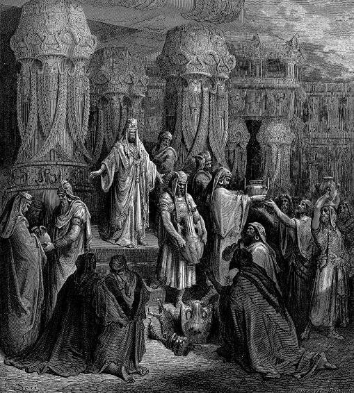 این نقاشی که پیشینه آن به سال ۱۸۶۶ میلادی میرسد برگی از انجیل مصور اثر «گوستاو دوره» هنرمند فرانسوی سده نوزهم میلادیست. معبد اورشلیم یا «معبد دوم» یکی از معابد مهم یهودیان در شهر اورشلیم بود که جایگزین معبد اول یا همان «معبد سلیمان» شد. معبد اول در سال ۵۸۶ پیش از میلاد و همزمان با تبعید یهودیان به بابل تخریب شده بود. با به قدرت رسیدن کورش بزرگ در ایران و آزاد شدن یهودیان و بازگشت آنها به اورشلیم بازسازی معبد سلیمان که در طول اسارت هفتاد ساله به ویرانهای غارت شده تبدیل شده بود، ممکن گردید. این تصویر با توجه به داستان روایت شده در عهد عتیق کوروش را به همراه یهودان در همین معبد و در حال جشن گرفتن بازگشایی آن به تصویر میکشد. بازسازی این معبد در دوران حکومت کوروش آغاز شد و در ششمین سال حکومت داریوش بزرگ به پایان رسید. این معبد بیش از چهارصد سال بعد توسط «هرود» باری دیگر به طور کامل بازسازی شد و از آن پس معبد هرود یا معبد سوم نام گرفت اما در سال ۷۰ پس از میلاد و در طی شورش چهار ساله یهودیان در اورشلیم علیه رومیان و پس از محاصره و فتح دوباره شهر توسط ارتش روم ویران شد.