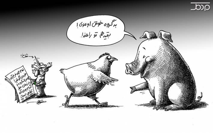 مرغ ،آهنگ جدایی ساز کرد. ناگهان از سفره ام پرواز کرد. از فراقش قلب بشقابم شکست. قاشق و چنگال من در غم نشست. دید او فیش حقوقم را مگر؟. کاین چنین از پیش من بگرفت پر. مرغکم رفتی تو از پیشم چرا. کردی از پیش خودت کیشم چرا. من به تو خیلی ارادت داشتم. حشر و نشری با کبابت داشتم. خاطراتت مانده در کنج اجاق. سوخت قلب دیگ تفلون از فراق. ران و بال و سینه ات یادش بخیر. قلب چون آیینه ات یادش بخیر. با سس قرمز چه زیبا می شدی. خوب و دلچسب و دلارا می شدی. ای فدای ژامبون رنگین تو. سوپ های داغ و آن ته چین تو. ناز کم کن پیش ماها هم بیا. لطف کن ،یک شام، اینجا هم بیا. دستمان از گوشت دور است ای نگار. پس تو دیگر اشکمان را در نیار. زندگی بی تو جهنم می شود. سکته ،اسبابش فراهم می شود. ای فدای قُد قُدایت باز گرد. این دل و جانم فدایت باز گرد. بی تو باور کن که مردن بهتر است. از جهان تشریف بردن بهتر است. از خر شیطان بیا پایین عزیز.