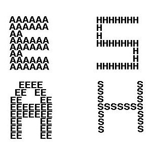 در بخش دیگری از این مطالعه به جای استفاده از انسانها، عکسهایی از حروف الفبایی به شرکتکنندگان نشان داده شد که از حروف دیگر تشکیل شده بودند. مثلا حرف H که بدنه آن از دهها حرف T تشکیل شده بود. از بعضی شرکتکنندگان خواسته شد که حروف کوچک را تشخیص دهند، تا در پردازش موضعی درگیر باشند. و از گروه دیگر خواسته شد که حرف بزرگتر را تشخیص دهند تا در پردازش کلی درگیر شوند.