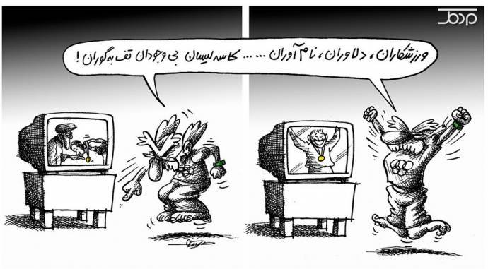 mehr47 - تهران - ایران. البته من این کاریکاتور رو قبول ندارم هر کس عقاید خودشو داره شاید یکی واقعا از این حکومت و حاکمش خوشش بیاد . اما هیچ بلایی نمیاد مطمئن باش نمونه محسن شادی وقتی سه سال پیش قهرمان زیر 23 سال جهان شد با مچ بند سبز مسابقه داد و با مچ بند سبز روی سکو رفت مدال گرفت اما بعدش محروم نشد مسابقات اسیایی رفت قهرمان شد امسال هم تو المپیک بود کلا ورزشکارای معروف و مدال اور رو نمی تونن محروم کنن