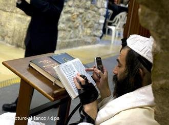 یک دیندار یهودی با تلفن همراه در کنار دیوار ندبه
