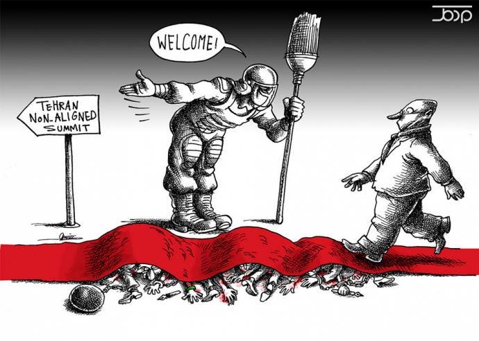 ایران با این کار میخواد سیمپاتی در میان کشورهای غیر متعهد ایجاد کنه به امید اینکه در تحریمها بهتر بتونه دور بزنه و اگر جنگی شد مظلومانه در این میان جلوه کنه و با خرج میلیاردها دلار برای این مهمانان و این اجلاس دوستان تازه ای پیدا کنه و هدف اصلی نجات رژیم اسد. ولی همه این آرزوها را به گور خواهد برد چون صدام هم از این اجلاسها بر پا کرد و در آخر تنها در یک سوراخ پیدایش کردند و جلوی چشم جهانیان دارش زدند. دیکتاتور ضعیف و کثافت ایران با زیر فشار گزاشتن مردمش به دنبال مشروعیت بین المللیست.