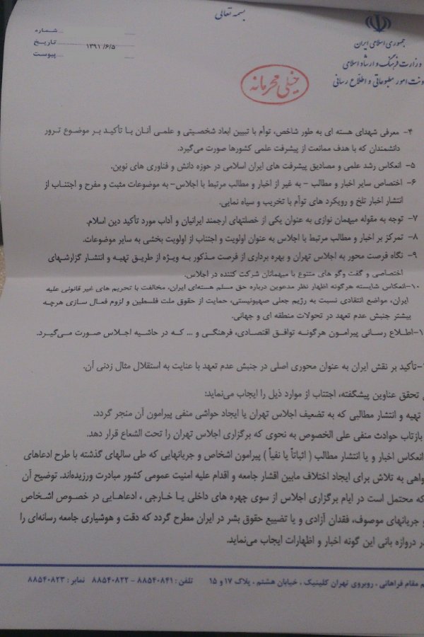به گزارش بامدادخبر، بر اساس این نامه که بر روی آن مهر «خیلی محرمانه» دیده میشود و امضای پدرام پاکآیین، مدیرکل امور مطبوعات و خبرگزاریهای داخلی وزارت ارشاد در زیر آن به چشم میخورد، از جمله به مدیران رسانهها توصیه شده تا «رویکرد ویژهای» به پیام رهبر جمهوری اسلامی به اجلاس یا سخنرانی وی در آن داشته باشند و همچنین سخنان رییسجمهور اسلامی و سایر مقامهای مسوول در این اجلاس را به صورت «شاخص» منتشر کنند.